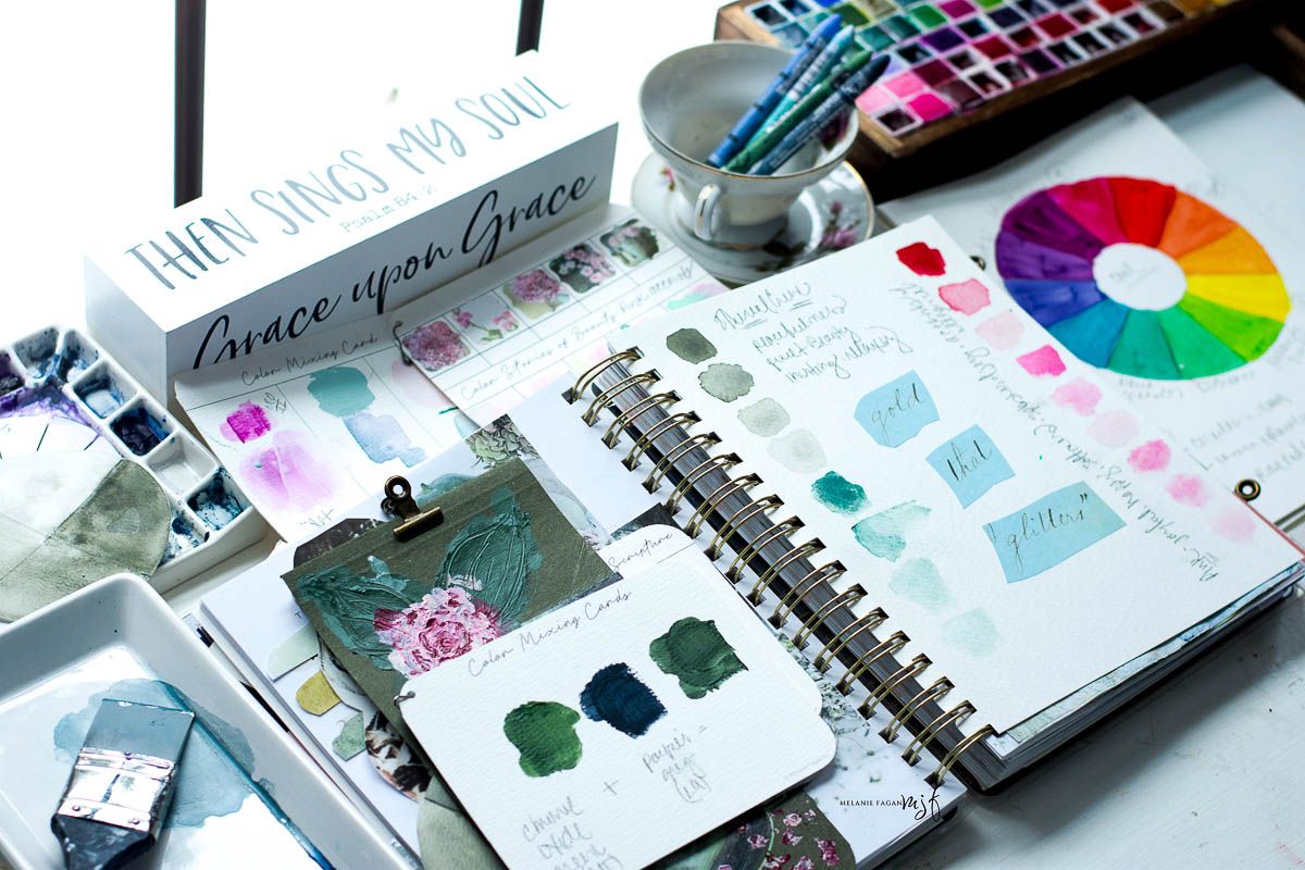 Inside Everyday Color Theory with Melanie Fagan, you’ll receive 26 beautifully guided video lessons walking you step-by-step through approachable, faith-nurturing color theory and hands-on creative practice. You’ll also get a stunning 24-page printable workbook to guide your exercises, reflections, and journal development. Together you’ll create a personalized Color Stories Journal while learning foundational color mixing techniques, complementary palettes, tints, tones, shading, mother color mixing, and meaningful color prompts that connect emotion, memory, Scripture, and beauty into cohesive color stories you can return to again and again.
